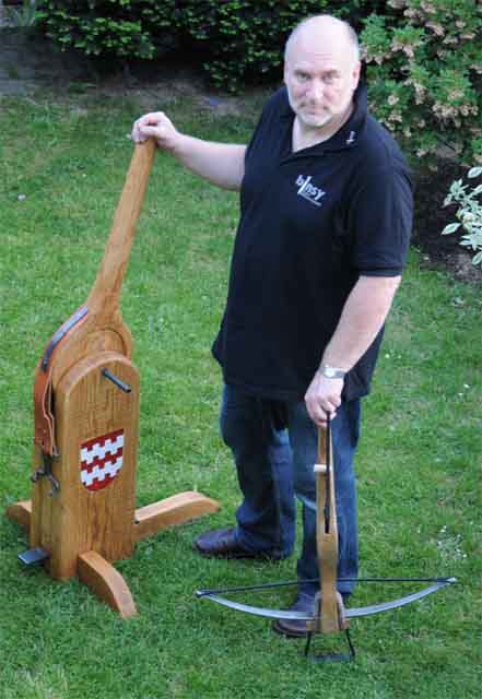 useful? You will find answers to these and other questions within BINSY's. The results of this trial show that it is possible to span even a heavy crossbow within some seconds. By using such a device one can increase the shoot freqency a lot and with less power than with a belt claw. Of course such a lever device is useful only for stationary application - it is to heavy for a mobile use. But for the defense of fortifications it could be a help. The complete text about use and construction you can get by BINSY .... (in German only - but with many photos)
